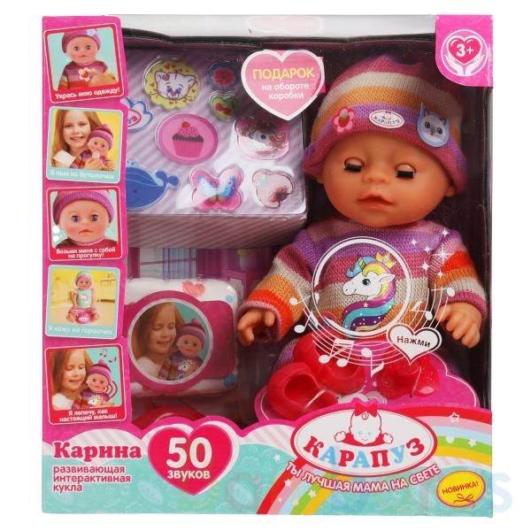 Интерактивный пупс «Карина» ТМ «Карапуз» станет замечательным подарком для вашей принцессы:- издаёт 50 детских звуков: «смех», «лепет», «гуление», «плач», «кашель», «чихание», «кряхтение», «капризы», «икота» и др.- произносит 15 фраз: «Спой мне колыбельную песенку», «Расскажи сказку, мамочка», «Пок…