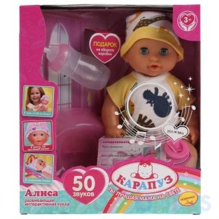Развивающая интерактивная кукла с аксессуарами «Алиса» ТМ «Карапуз» станет прекрасным подарком для вашего ребёнка:- издаёт 50 детских звуков: смех, лепет, гуление, плач и др. - пьёт из бутылочки- ходит на горшок- закрывает глазкиВ комплекте:- соска- горшок- бутылочка- свидетельство о рожденииЭтот м…