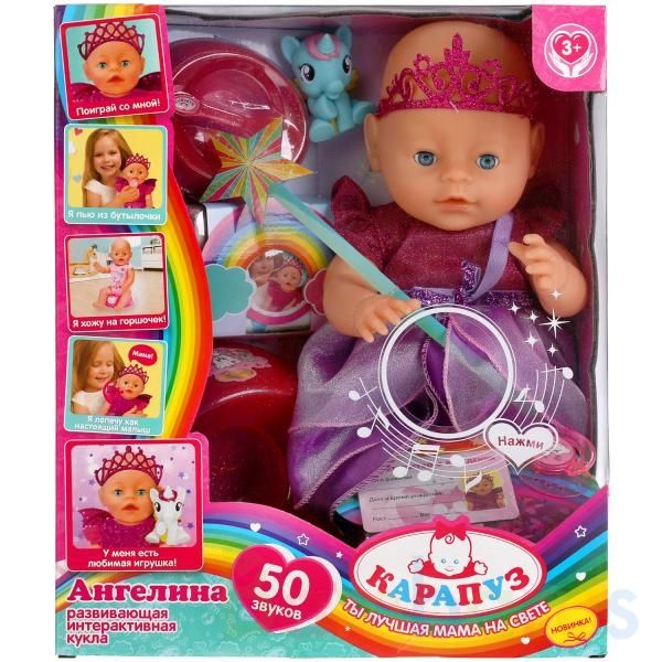 Развивающая интерактивная кукла «Ангелина» ТМ «Карапуз» станет прекрасным подарком для вашей принцессы:- говорит 15 фраз: «Спой мне колыбельную песенку», «Расскажи сказку, мамочка», «Покорми меня, мамочка», «Одень меня потеплее, мамочка», «Я так люблю с тобой играть!», «Поменяй мне памперс», «Возьм…