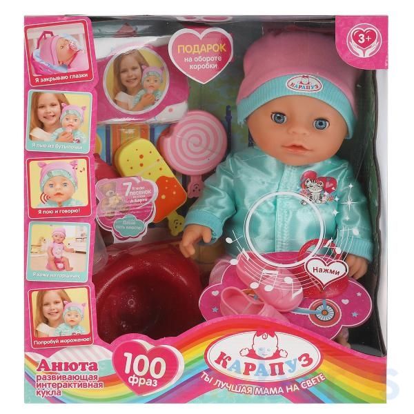 Развивающая интерактивная кукла «Анюта» ТМ «Карапуз» станет прекрасным подарком для вашего ребёнка:- поёт 7 песен на стихи А. Барто: «Лошадка», «Бычок», «Зайка», «Мячик», «Козлёнок», «Кораблик», «Мишка»- говорит разнообразные фразы- пьёт из бутылочки- ходит на горшок- закрывает глазкиВ комплекте:- …