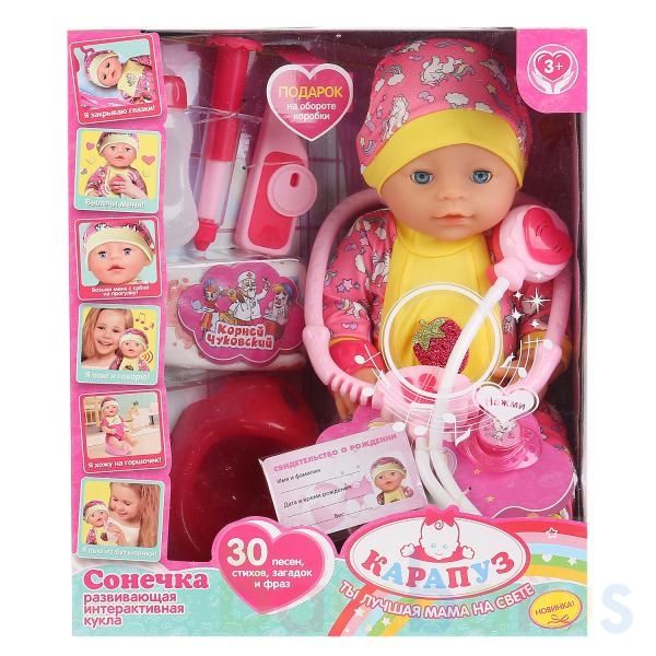 Развивающая интерактивная кукла с аксессуарами «Сонечка» ТМ «Карапуз» станет прекрасным подарком для вашего ребёнка: - 2 стихотворения Корнея Чуковского: «Муха-Цокотуха», «Айболит»- фразы: «Посади меня на горшочек!», «Ты самая лучшая мама на свете!», «Поцелуй меня, мамочка!», «Я тебя люблю!» и др.-…