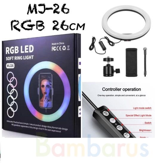 Лампа крепится на телескопическом штативе-треноге. Его можно регулировать по высоте. Кольцо поворачивается на 180 градусов. Кольцевая лампа MJ26 c RGB (разноцветная) заряжается от USB, легкая и практичная. Ее удобно разбирать для переноса, в помещении она не занимает много места и гармонично вписывается в современные дизайны студий и квартир.