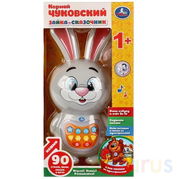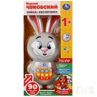 Яркий весёлый "Зайка-сказочник" - эксклюзивный хит продаж ТМ "Умка". Он выполнен из прочной пластмассы, окрашен в серый цвет, на мордочке изображены большие глаза, нос и широкая улыбка. На животе у зайца находятся 8 кнопок, нажимая которые, ребёнок услышит 4 сказки К. Чуковского, 59 стихов М. Дружининой, 24 песни и 6 потешек. Ещё 2 кнопки предназначены для регулирования громкости. Оснащён световым модулем, поэтому во время звучания загораются разноцветные лампочки. Развивает зрение, память, осязание, воображение, мелкую моторику, слух. Рекомендовано детям от 1 года. Работает от 3 батареек типа АА (входят в комплект).