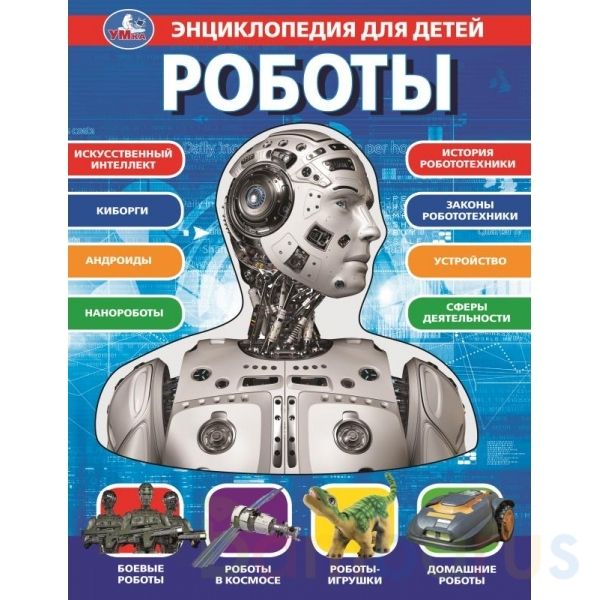 Яркая и красочная энциклопедия познакомит ребёнка с удивительными роботами, расскажет о видах роботов, о том какие бывают роботы в фантастических фильмах и книгах и как реальные роботы используются в науке и даже дома, поведает об их устройстве, а также об истории и законах робототехники. Можно изучать роботов через прозрачные окошки. Зрелищные фото и удивительные факты о робототехнике увлекут ребёнка и помогут ему быстро, эффективно и с удовольствием усвоить новую информацию.