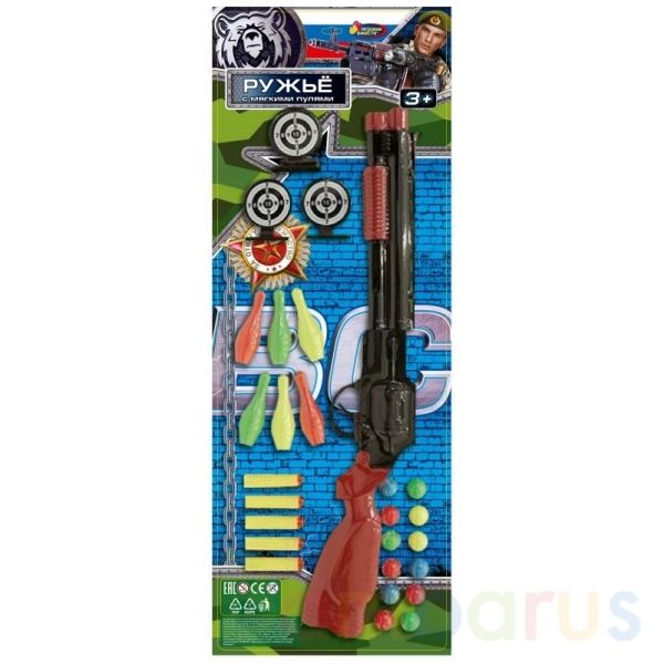 Ружьё с мягкими пулями ТМ «Играем вместе» непременно понравится юному герою:- реалистичный дизайнВ комплекте:- ружьё- 5 безопасных мягких пуль- 12 шариков для стрельбы- 3 мишени- 6 кеглейС таким оригинальным игровым оружием ваш ребёнок будет придумывать увлекательные спецзадания, защищать мир и сто…