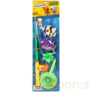С этим набором здорово играть в ванне. Запусти рыбок в воду и попробуй поймать их! После того, как рыбка попадётся на крючок, скорее подсекай и хватай рыбку с помощью сачка. Яркая, удобная удочка с катушкой, регулирующей шнур, легко захватывает разноцветных рыбок и поднимает к юному рыбаку.