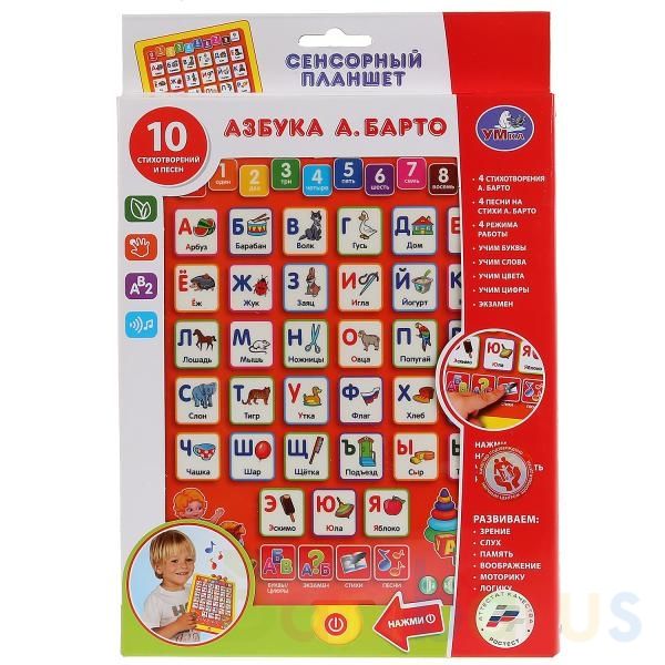 Сенсорный планшет "Умка" - новая развивающая игрушка для детей. Планшет обучает азбуке, цифрам, цветам, словам, а также стихам и песням. В игрушку заложена только полезная для малышей информация, обучение будет проходить поэтапно. Сначала ребёнок выучит буквы, потом услышит слова, начинающиеся с этой буквы, тематические песенки и стихи. После этого родители смогут проверить усвоенные ребёнком знания, нажав на кнопку "Экзамен". Планшет имеет простое управление и приятные на ощупь клавиши. Дизайн игрушки полностью повторяет современные планшеты: тонкий корпус, кнопка влючение/выключение, иконки на экране. Это наверняка понравится продвинутым деткам. Есть функция регулирования громкости. Развивает память, логику, внимание, зрение, слух, осязание, мелкую моторику рук. Рекомендовано детям от 1 года. Работает с помощью 3 батареек типа АА (входят в комплект).