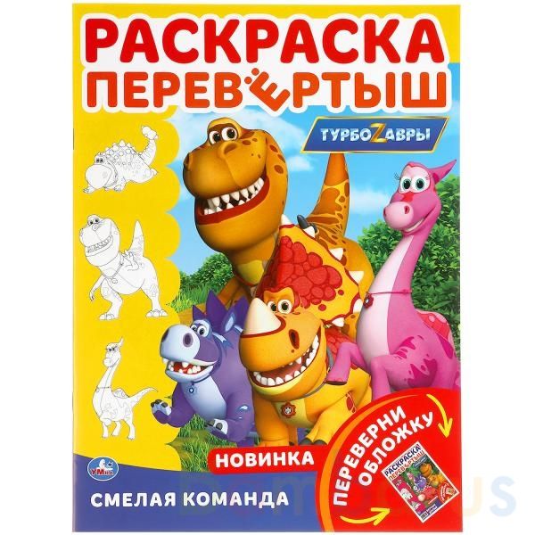 Раскраска-перевёртыш «Турбозавры. Смелая команда» обязательно заинтересует ребёнка: