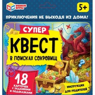 Карточная игра «Супер квест. В поисках сокровищ» ТМ «Умные игры» - отличный подарок для маленького любознайки.Комплектация и особенности:- 18 игровых карточек с заданиями и подсказками- правила игры (инструкция для родителей)- красочный дизайн- продолжительность игры: 5-10 минутДанная игра поможет …
