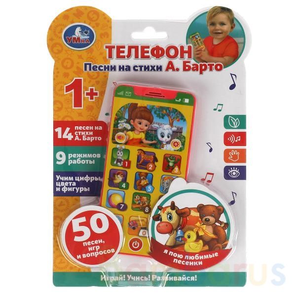 Музыкальная игрушка «Телефон с песнями на стихи А. Барто» ТМ «УМка» станет прекрасным подарком для ребёнка:- 14 песен на стихи А. Барто: «Козлёнок», «Зайка», «Лошадка», «Лягушата», «Воробей», «Мишка», «Слон», «Мячик», «Бычок», «Ути-ути», «Грузовик», «Самолёт», «Флажок», «Жук»- реалистичные звуки те…