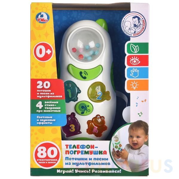 Обучающий телефон-погремушка ТМ «УМка» без сомнения понравится малышу:- учим голоса животных- 10 потешек («Ехали-ехали», «Гуси», «Андрей воробей», «Во саду ли в огороде», «Водичка», «Как у наших у ворот», «Сени», «Калинка», «Козлик», «Валенки»)- 10 песен из мультфильмов («Песенка мамонтенка», «Если…