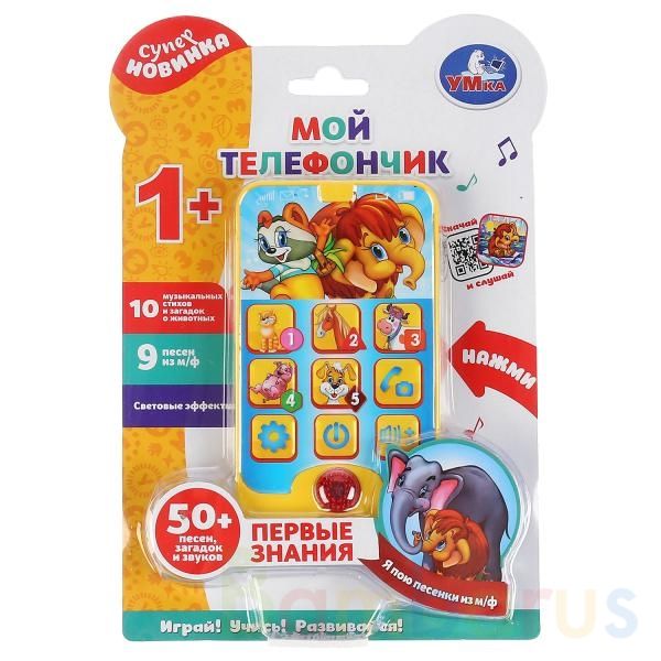 Музыкальная развивающая игрушка «Мой телефончик. Первые знания» ТМ «УМка» станет прекрасным подарком для малыша:- 14 песен на стихи А. Барто: «Бычок», «Зайка», «Лошадка», «Лягушата», «Воробей», «Мишка», «Слон» и др.- 3 потешки: «Водичка», «Два весёлых гуся», «Петушок»- учим цифры и названия игрушек…