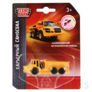 Машинка "Карьерный самосвал" - это коллекционная металлическая модель ТМ "Технопарк". Корпус окрашен в жёлтый цвет, дополнен подвижными элементами. Оснащена инерционным механизмом: если поставить машинку на ровную поверхность и потянуть за корпус, то она поедет сама. Развивает мелкую моторику, воображение, расширяет кругозор. Размер 7,5 см. Рекомендуется детям от 3 лет.