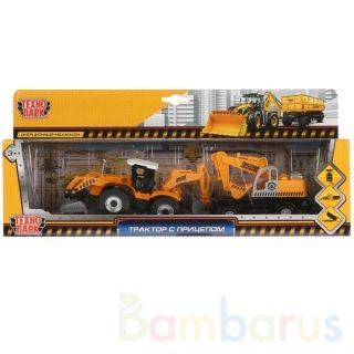 Металлическая машинка "ТРАКТОР С ПРИЦЕПОМ" — новинка ТМ "Технопарк" с множеством подвижных элементов. У трактора поднимаются и опускаются передний ковш и задняя дробилка, прицеп съёмный, с подъёмным кузовом. Трактор является миниатюрной копией настоящей строительной техники. Игрушка сделана из металла и прочной пластмассы и окрашена в оранжевый цвет. На спецтехнике нанесены надписи "Горстрой". Длина машины вместе с прицепом — 28,5 см. Трактор оснащён инерционным механизмом: если его оттянуть назад и отпустить, он поедет самостоятельно. Игрушка развивает мелкую моторику рук, воображение и расширяет кругозор ребёнка. Рекомендуется детям с 3 лет.