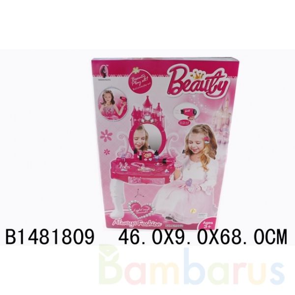 Небольшой столик на ножках дополнен резным зеркалом с цветными камушками. В выдвижной ящичек можно сложить разные мелочи. С таким набором маленькая принцесса сделает себе прекрасную причёску и макияж, и будет неотразимой на любом празднике.