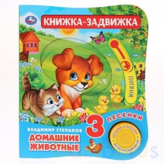 На каждой страничке красивые иллюстрации и добрые стихи о домашних животных Владимира Степанова. Потяни задвижку на обложке и часть картинки придёт в движение. Малыш будет с удовольствием рассматривать яркие страницы с изображением животных, слушать песни, подпевать и даже танцевать. Ребёнок легко освоит включение звука: по нажатию на кнопку начинает проигрываться песенка, при втором нажатии звук выключится. Нажав на кнопку ещё раз ребёнок, услышит следующую песню. Композиции исполняются профессиональными артистами. Книжка сделана из плотного картона, поэтому можно не опасаться, что ребёнок порвёт странички.