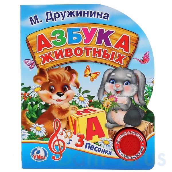 Музыкальная книга «Азбука животных» М.Дружинина ТМ «УМка» станет прекрасным подарком для ребёнка.Комплектация и функции:- 1 звуковая кнопка- 3 песенки- азбука- стихи М.Дружининой: «Тюлень», «Улитка», «Филин», «Хорёк», «Цыплёнок», «Чижик» и др.- красочные иллюстрации- фигурная вырубкаНа каждой стран…