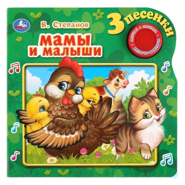Музыкальная книжка «Мамы и малыши» В. Степанов ТМ «УМка» станет прекрасным подарком для ребёнка.Комплектация и функции:- 1 звуковая кнопка- 3 песенки: «Кошка и котята», «Лошадь и жеребёнок», «Свинка и поросята»- стихи В. Степанова: «Кошка и котята», «Корова и телёнок», «Овечка и ягнёнок», «Собака и…