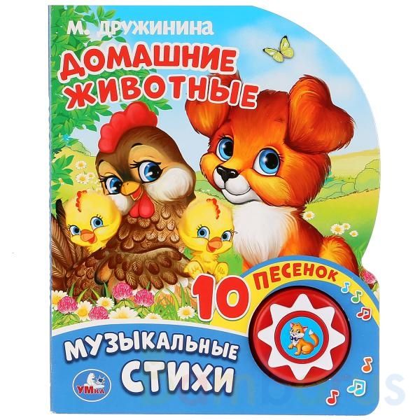 Музыкальная книжка «Домашние животные» М. Дружинина. ТМ «УМка» для маленьких любознаек:- 1 звуковая кнопочка- 10 песен на стихи М. Дружининой о домашних животных- красочные иллюстрацииДобрые стихи о домашних животных, песенки и красочные иллюстрации расширят кругозор ребёнка. Малыш будет с удовольс…