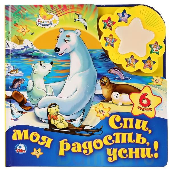 Музыкальная книга с ночником «Спи, моя радость, усни» ТМ «УМка» станет прекрасным подарком для ребёнка:- 6 колыбельных песен (фрагменты): «Колыбельная Медведицы», «Приди, котик, ночевать», «Ой, спи, ангел, почивай», «Спи, младенец мой прекрасный», «Баю-бай, ты, собачка, не лай», «Спи, усни, мой род…