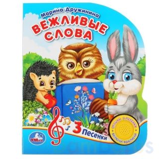 Ребенок с удовольствием будет листать плотные страницы с яркими картинками, читать короткие стихи про вежливые слова и слушать веселые песенки. Эта добрая и увлекательная книжка для малышей с особенным сюрпризом-изюминкой: стоит ребёнку нажать на желтую кнопку, и он услышит песню, если нажать ещё раз, музыка утихнет, в 3-й раз - следующая песня и т.д.