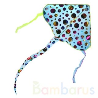 Воздушный змей «Скат» с перламутровыми вставками и хвостом подарит радость детям. Леска длиной 28 метров позволит подняться яркому змею очень высоко.