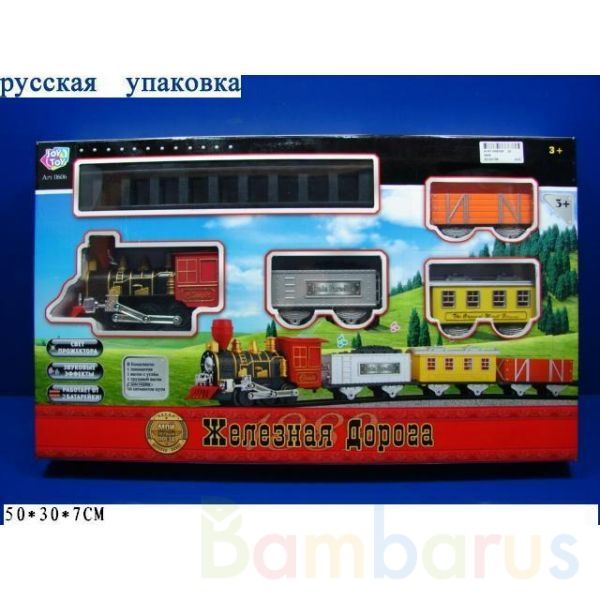 Железная дорога с поездом – мечта любого ребенка. Эта игрушка приведёт в восторг малыша и подарит ему массу незабываемых эмоций! Паровоз совсем как настоящий: он воспроизводит звуки и светит фарами. В этом наборе состав дополняют 3 грузовых вагона. Помогайте вашему малышу собрать железнодорожные пути, расставляйте аксессуары и отправляйтесь в интереснейшие путешествия! Игрушка сертифицирована, укомплектована батарейками АА*3. Рекомендуется для детей старше 3 лет.