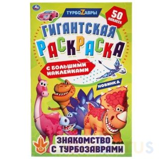 Гигантская раскраска с большими наклейками «Знакомство с турбозаврами» ТМ «УМка» непременно понравится маленьким поклонникам популярного мультсериала о динозаврах с удивительными способностями: